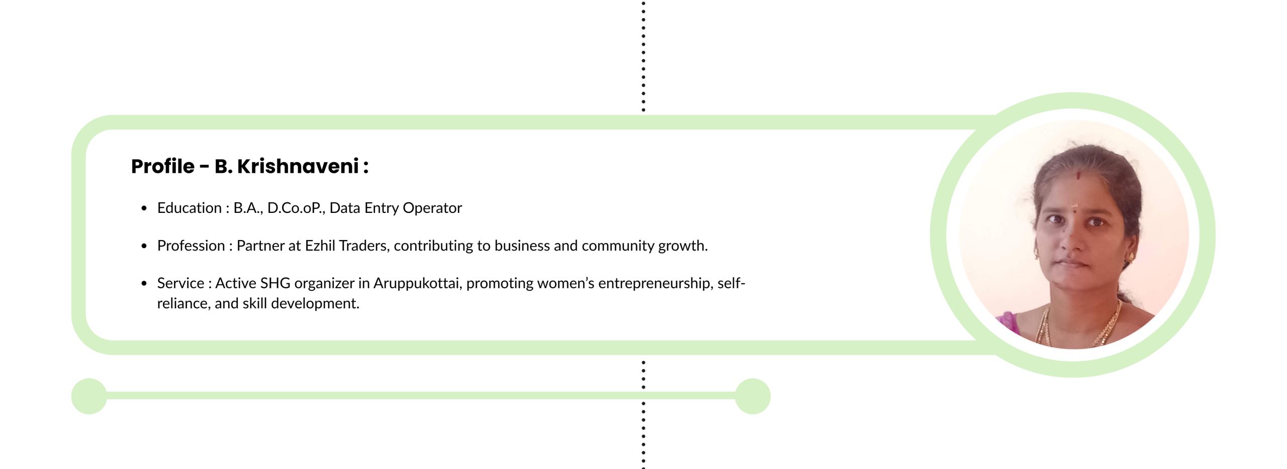 - Service: Active SHG organizer in Aruppukottai, promoting women’s entrepreneurship, self-reliance, and skill development.